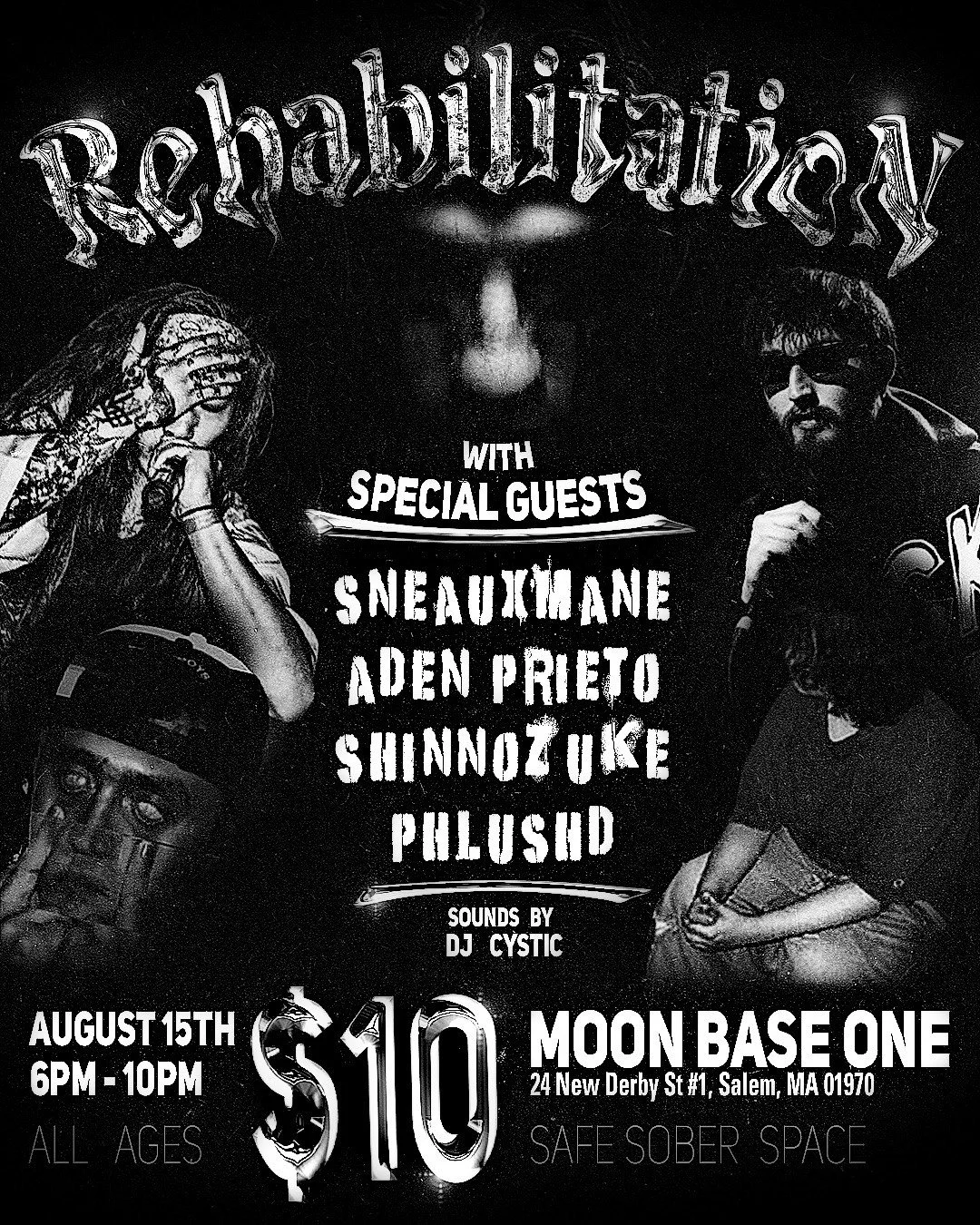 08/15/2025 REHABILITATION WITH SPECIAL GUESTS: SNEAUXMANE, ADEN PRIETO, SHINNOZUKE, PHLUSHD. PLUS - SOUNDS BY DJ CYSTIC Friday, August 15, 2025 6:00 PM 10:00 PM MOON BASE ONE 24 New Derby Street Salem, MA, 01970 United States (map) Google Calendar ICS