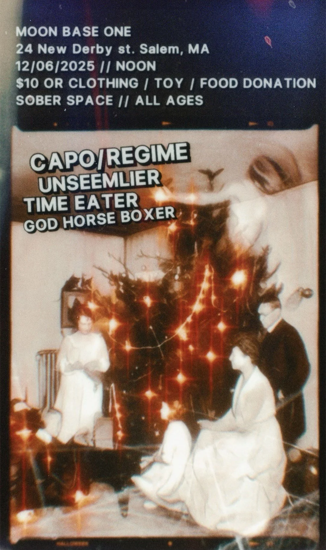12/06/2025 Capo/Regime, Unseemlier, Time Eater, God Horse Boxer Saturday, December 6, 2025 12:00 PM 4:00 PM Moon Base One 24 New Der (map) Google Calendar ICS