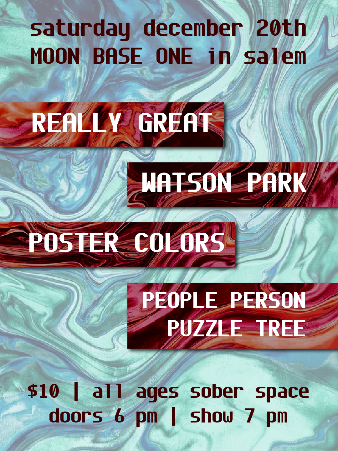 12/20/25 Really Great, Watson Park, Poster Colors, People Person Puzzle Tree Saturday, December 20, 2025 6:00 PM 10:00 PM MOON BASE ONE 24 New Derby Street Salem, MA, 01970 United States (map) Google Calendar ICS