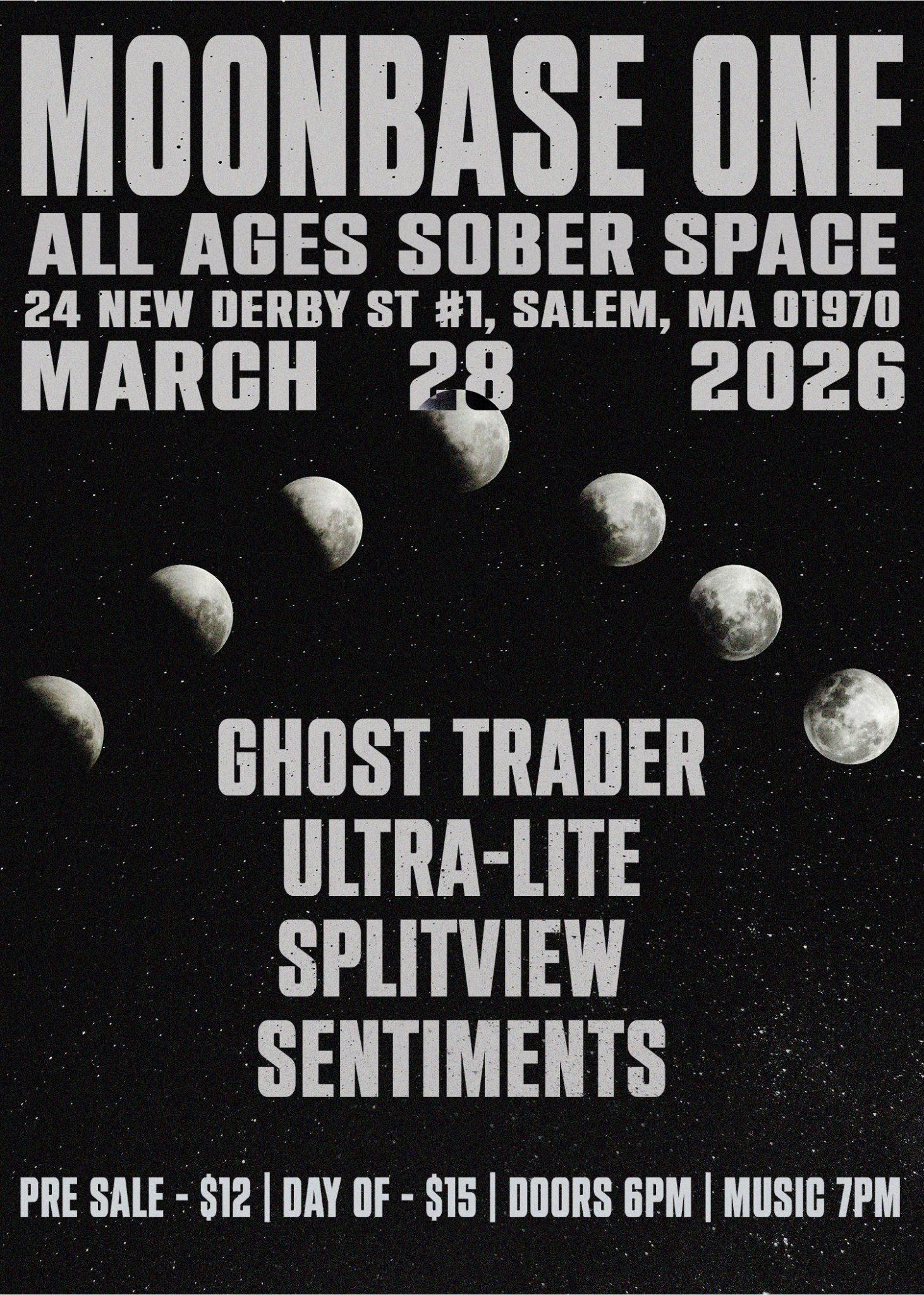 Back to All Events 3/28/2026 Ghost Trader, Ultra-Lite, Splitview, Sentiments Saturday, March 28, 2026 6:00 PM 10:00 PM Moon Base One 24 New Derby Street Salem, MA, 01970 United States (map) Google Calendar ICS